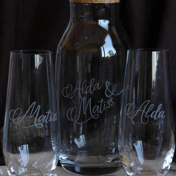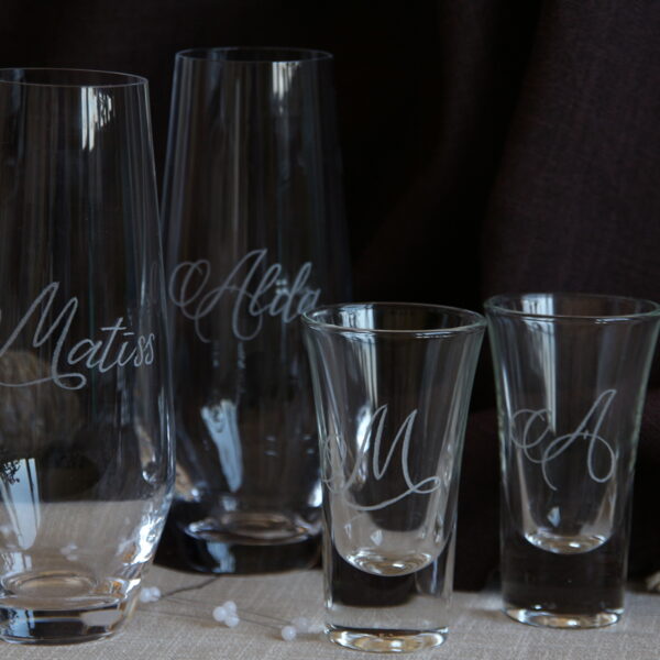 Gravēju uz visdažādākajām glāzēm Un ne tikai - vīna, viskija, konjaka, sulu glāzes, krūzes, karafes un blašķes. Veidoju dizainus pēc klientu vēlmēm. Šai galerijā apskatāmi mani darbi, kuri ir individuāli veidoti vai gravēti uz citas formas glāzēm, traukiem.
