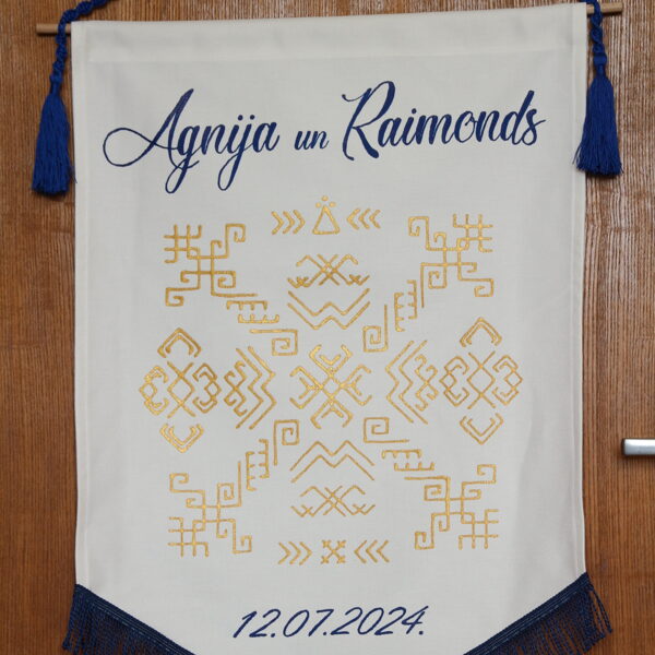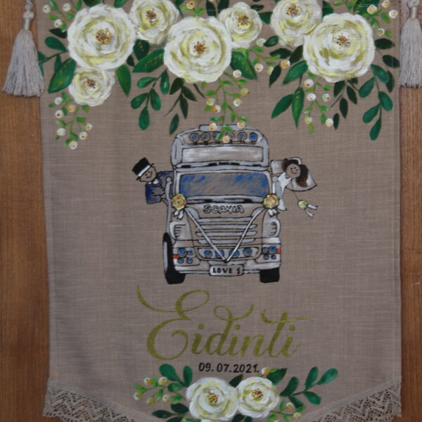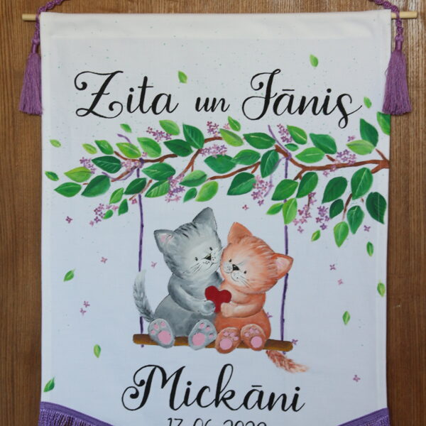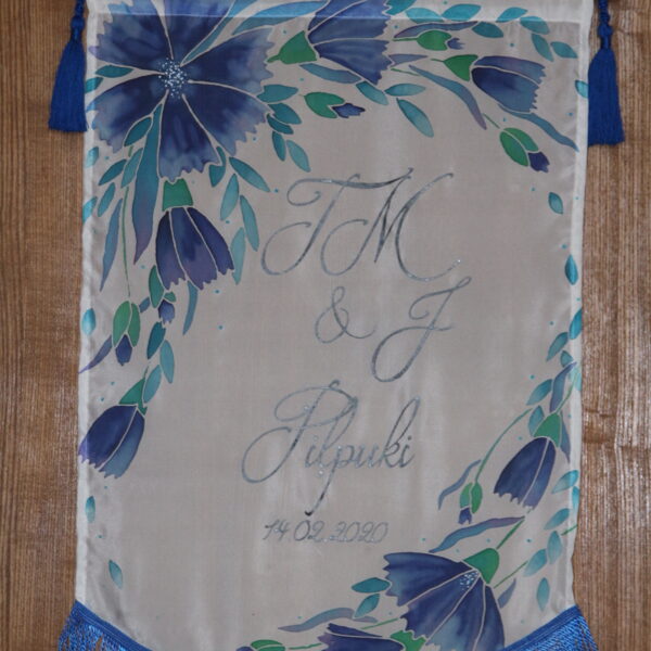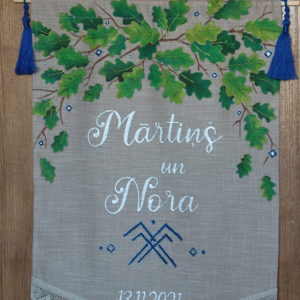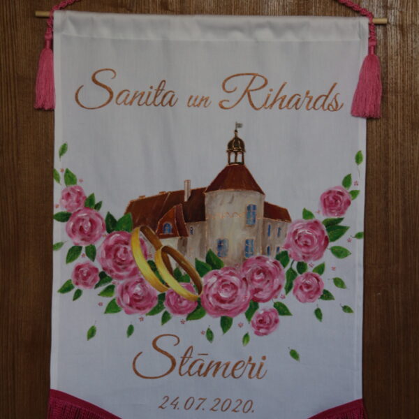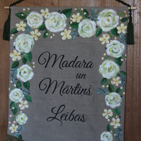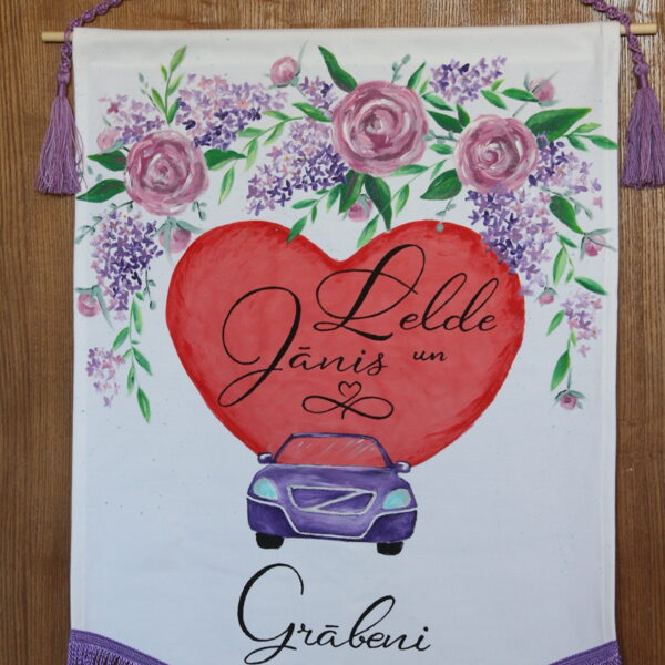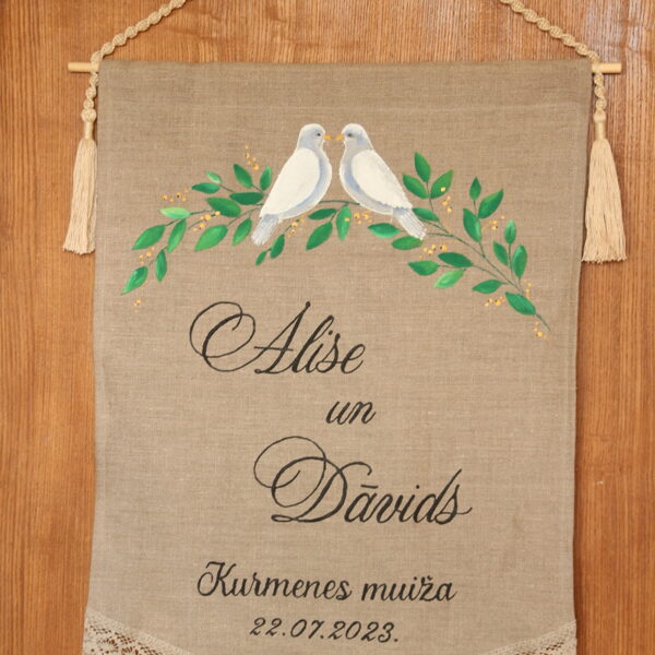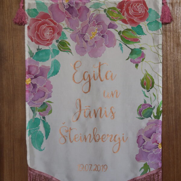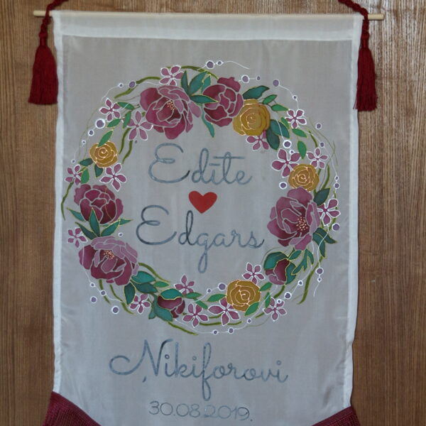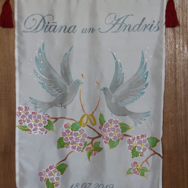 Kāzu karogi uz lina, kokvilnas vai zīda. Zīmēts ar auduma krāsām. Cena 50 eur Izmērs 50X70 cm